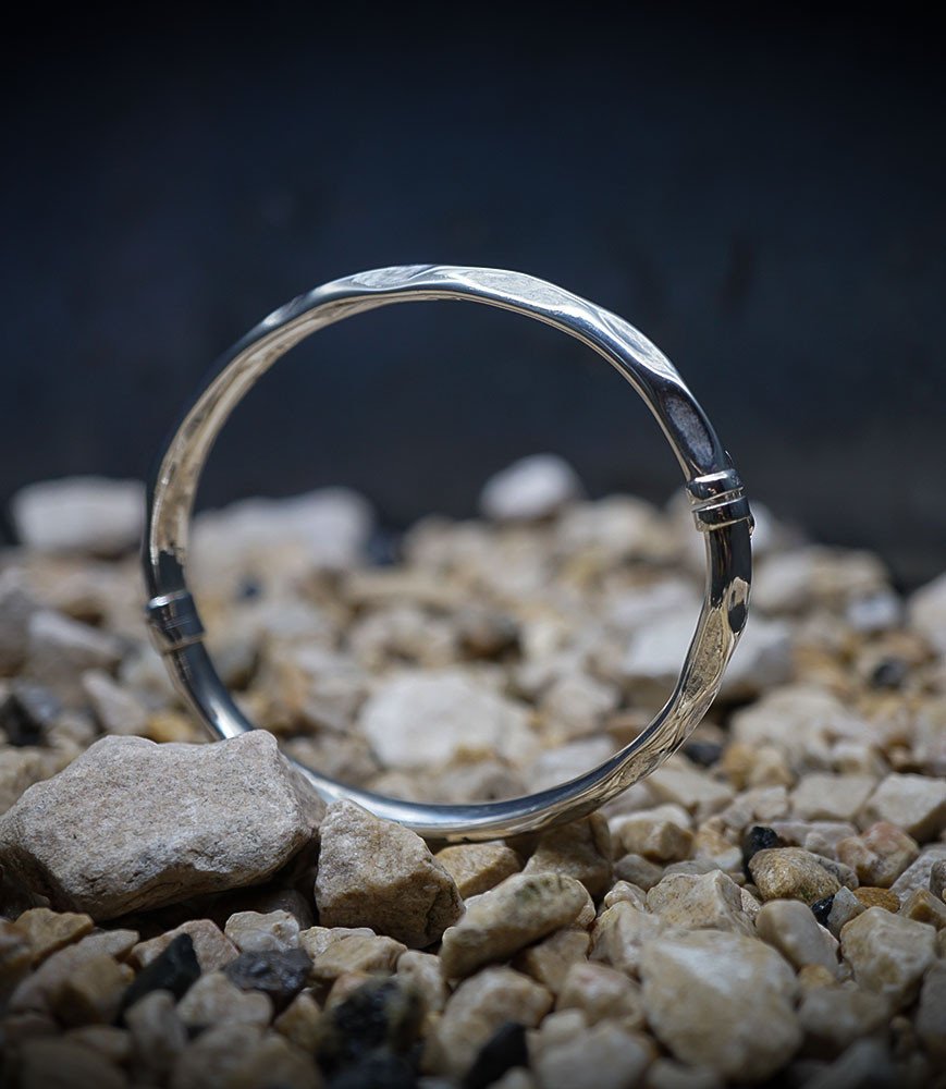 Open bangle bracelet that can be adjusted to different wrist sizes.
